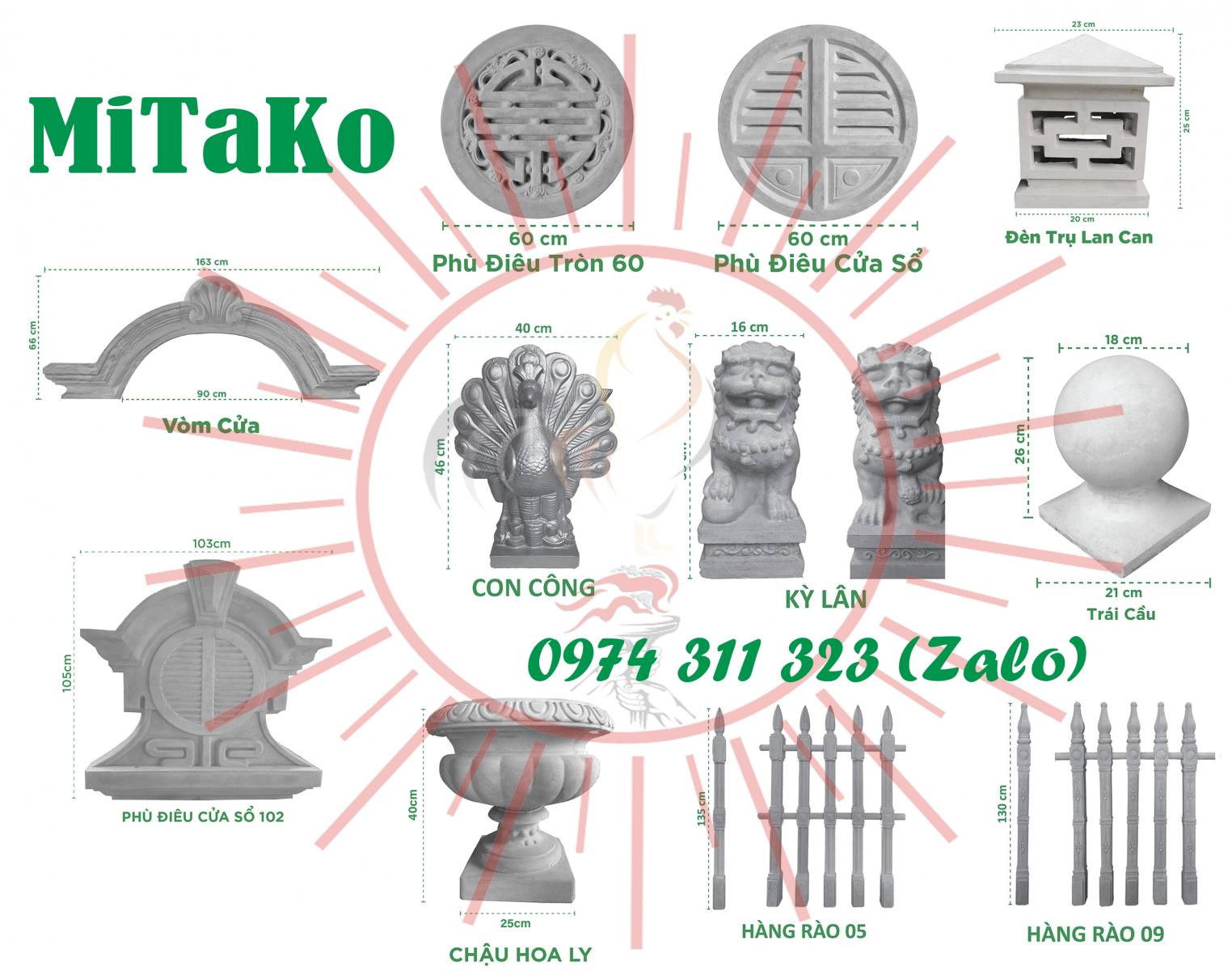 Các sản phẩm của MiTaKo cung cấp gồm có con sơn bê tông , con kê bê tông , bông trần xi măng ,.. Sản phẩm con tiện bê tông , con tiện xi măng , trụ lan can bê tông , phù điêu hoa văn xi măng cổ điển và Tân cổ điển . Ngoài ra MiTaKo còn sản xuất và cung cấp các loại phào chỉ bê tông , phào chỉ GFRC(GRC) cho các công trình và dự án lớn trên cả nước .